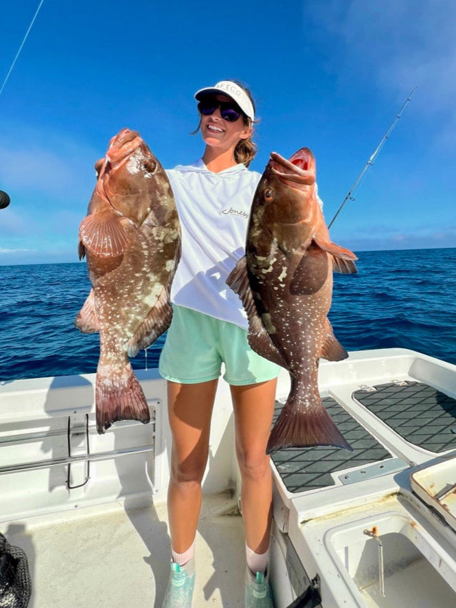 Rachael keeping it clean in her hooded fishing shirt and two nice groupers
