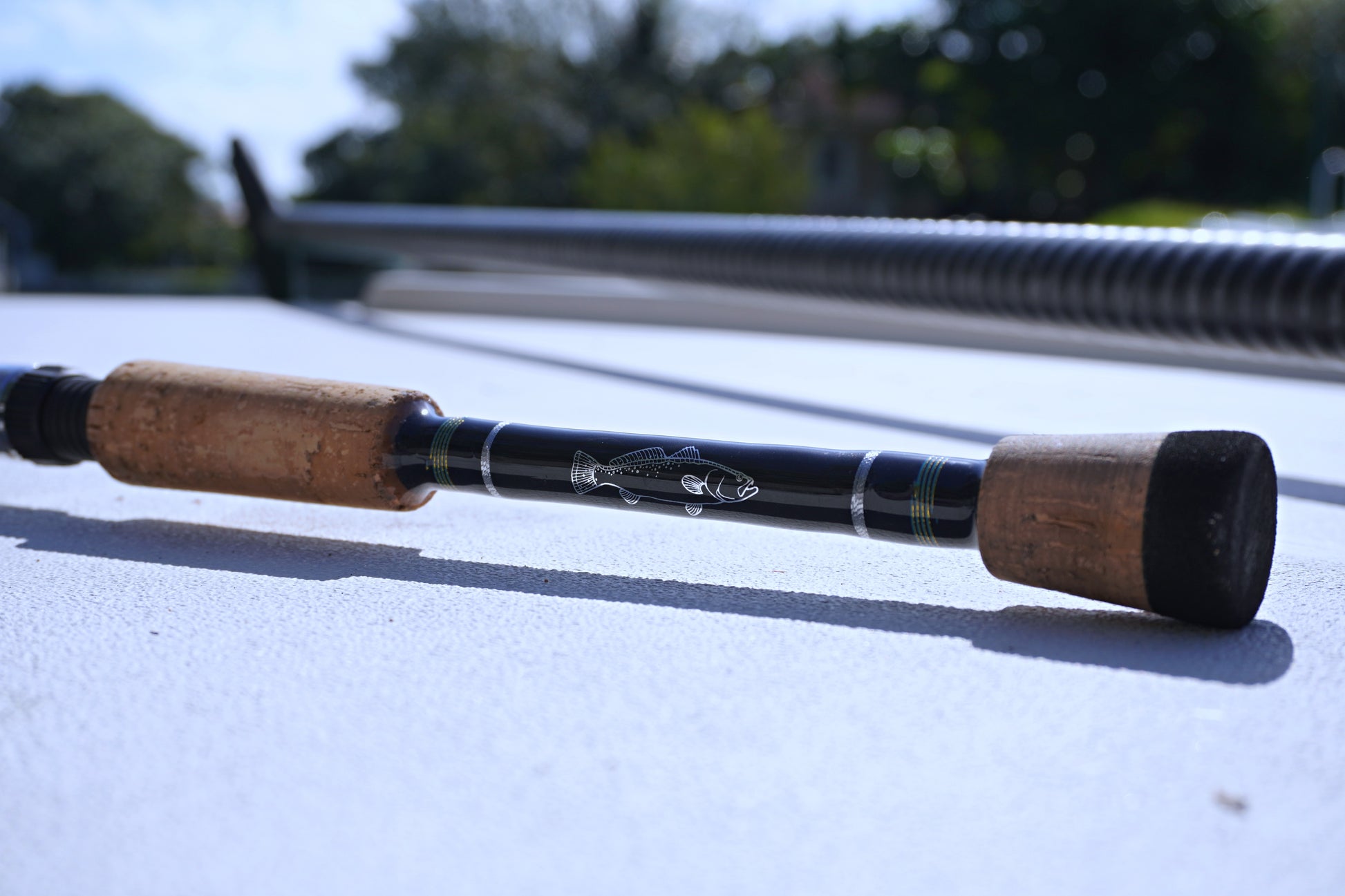 Graphite Fuji reel seat with cork split grips. (10) Titanium Fuji micro-guides keep this rod extremely lightweight and sensitive for feeling bites on all your light tackle inshore fishing. Speckled trout chrome decal.